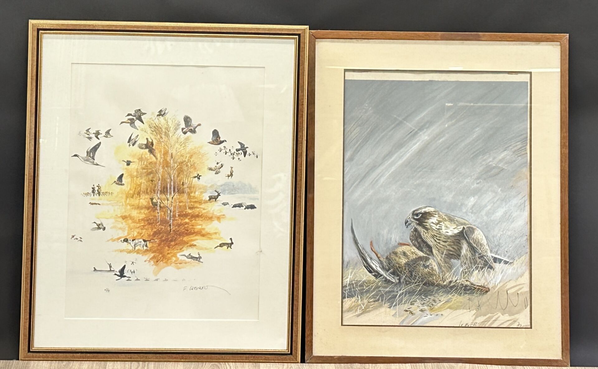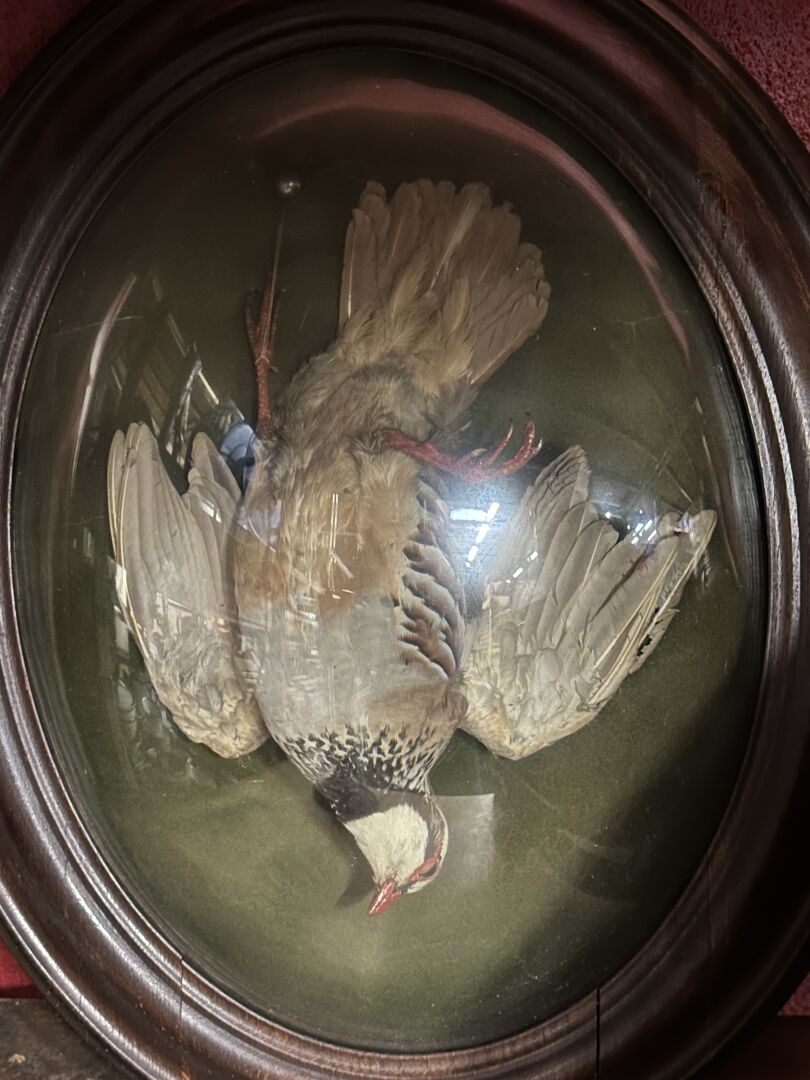 Trophée de perdrix suspendu dans un cadre en bois ovale et verre bombé (verre fendu).