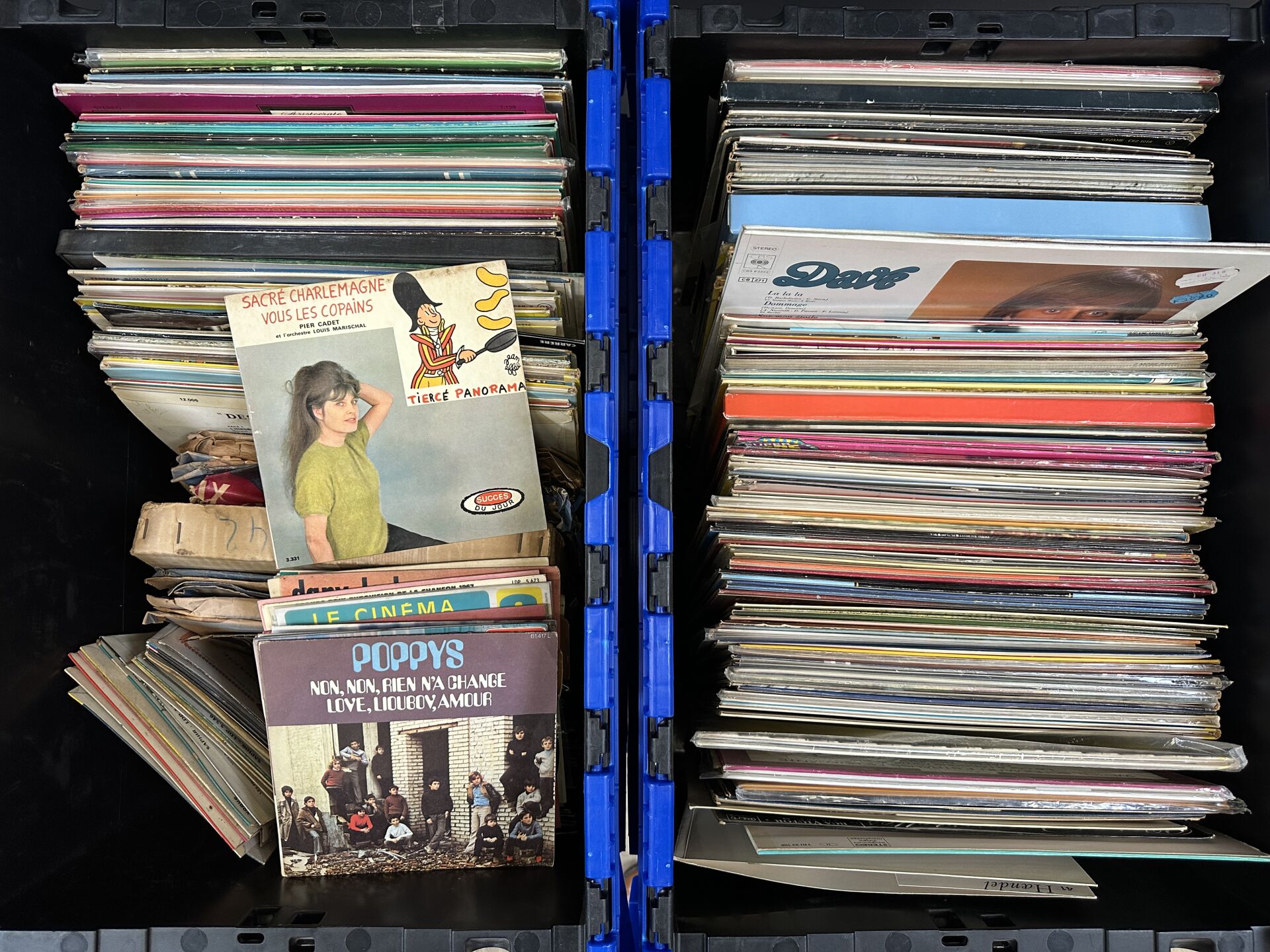 Réunion d’environ 160 vinyles 33 et 45 tours, musique classique et variété française...