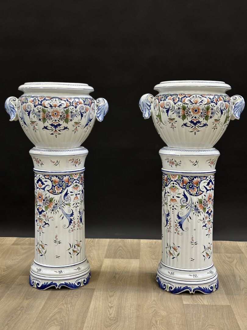 Paire de cache-pots et leurs sellettes en porcelaine émaillée polychrome à décor de fleurs et...