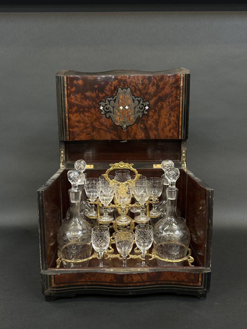 Cave à liqueur en placage de loupe de noyer orné d’incrustations de nacre et laiton doré...