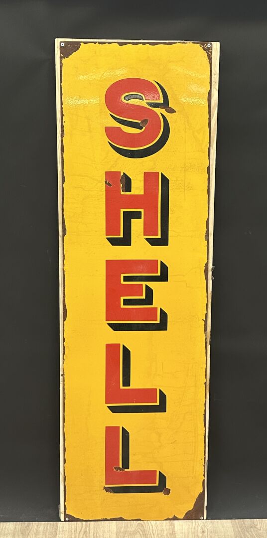 Plaque publicitaire en tôle émaillée pour SHELL, verticale, vissée sur une planche en bois...