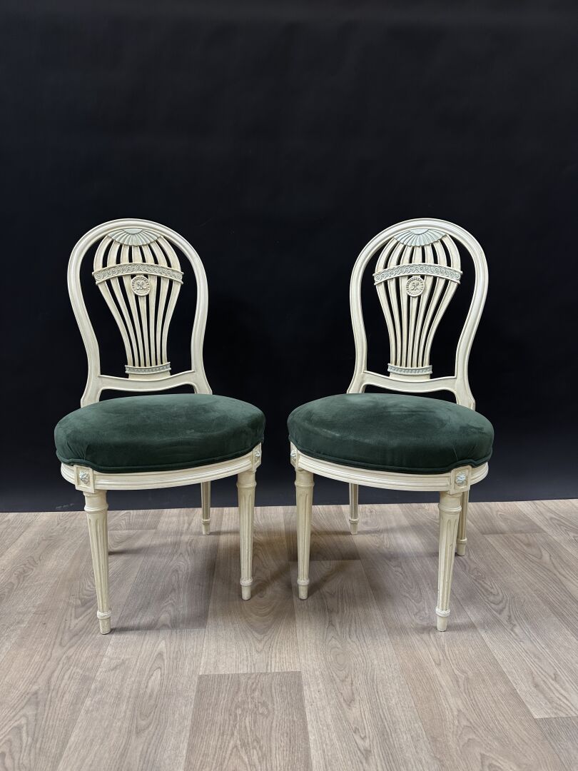 Paire de chaises à la Montgolfières en bois sculpté relaqué crème, les dossiers ajourés en...