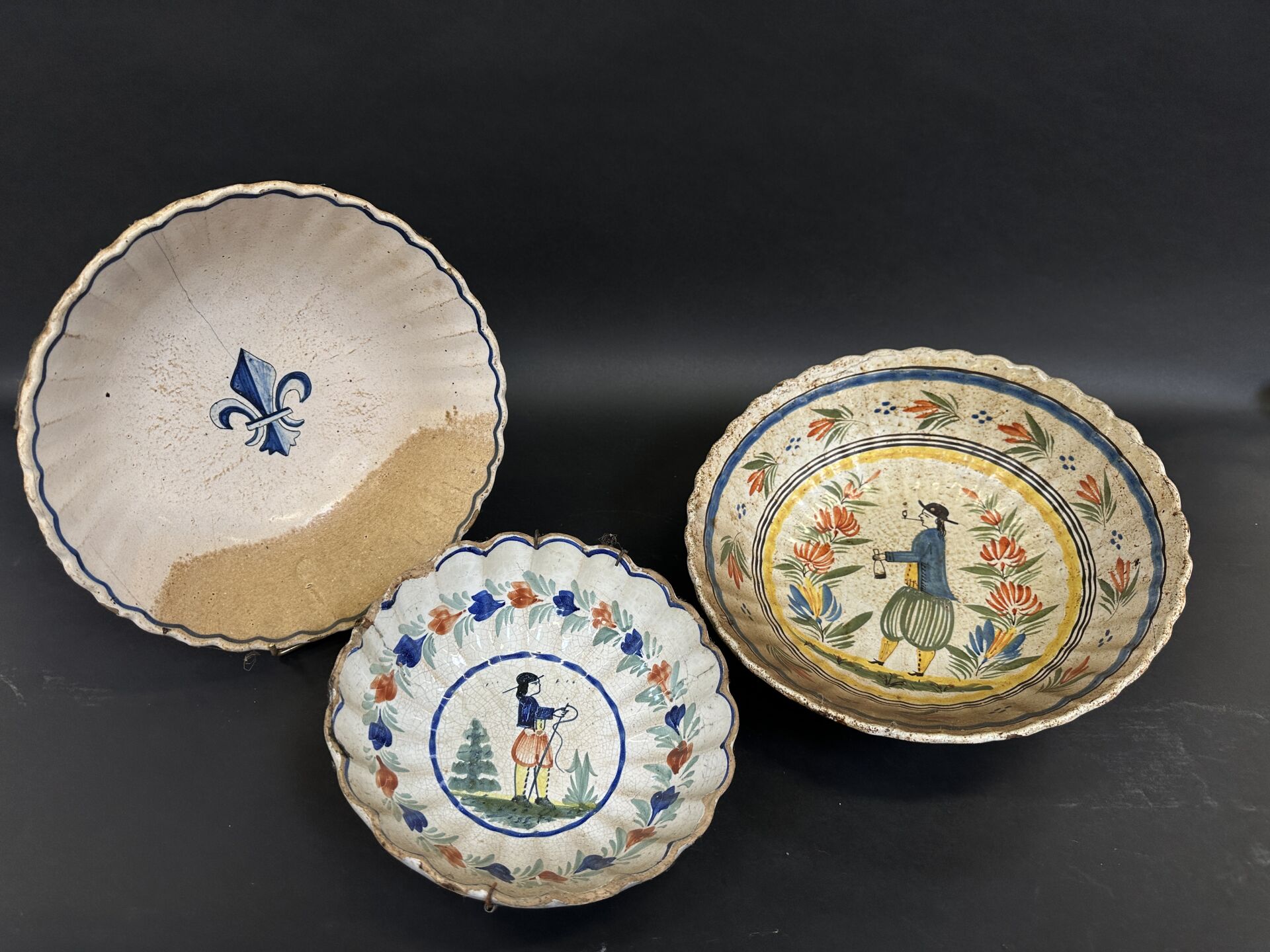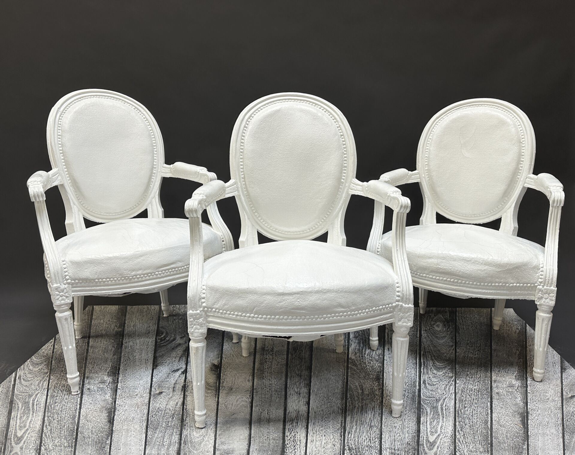 Suite de trois fauteuils en bois à dossier médaillon, les pieds fuselés, cannelés, rudentés....