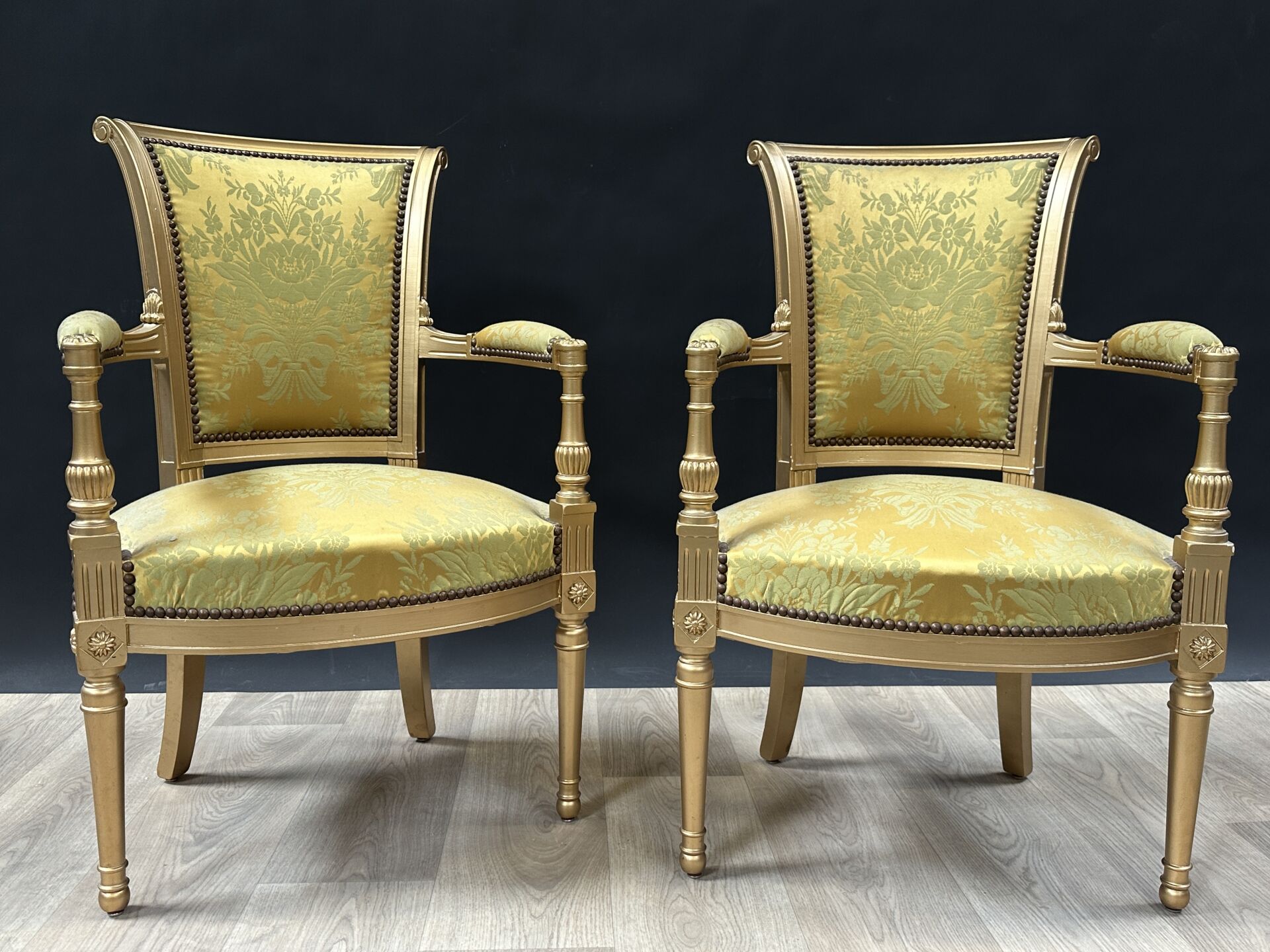 Paire de fauteuils cabriolets en bois mouluré redoré, dossier renversé à enroulement, bras à...