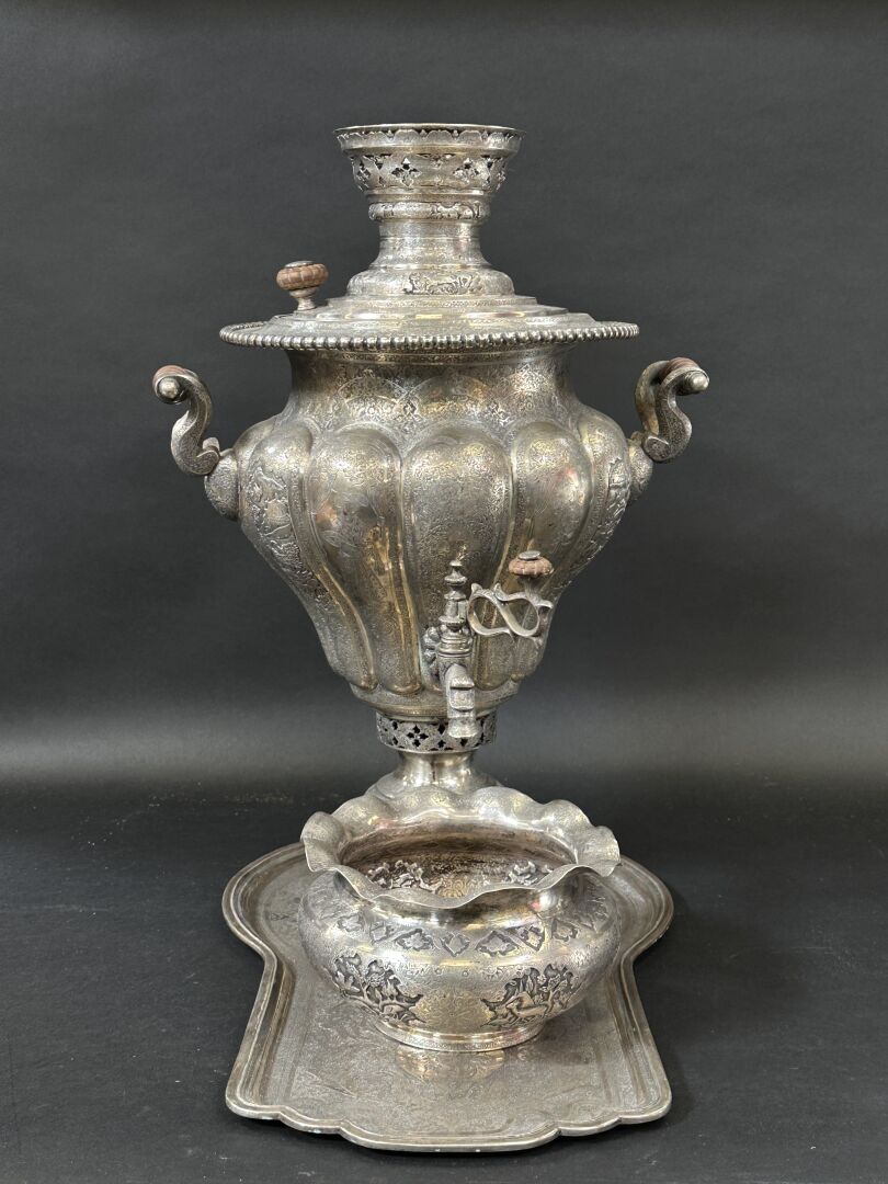 Samovar en argent 875 millièmes (84 zolotniks) finement gravé et ciselé de personnages...