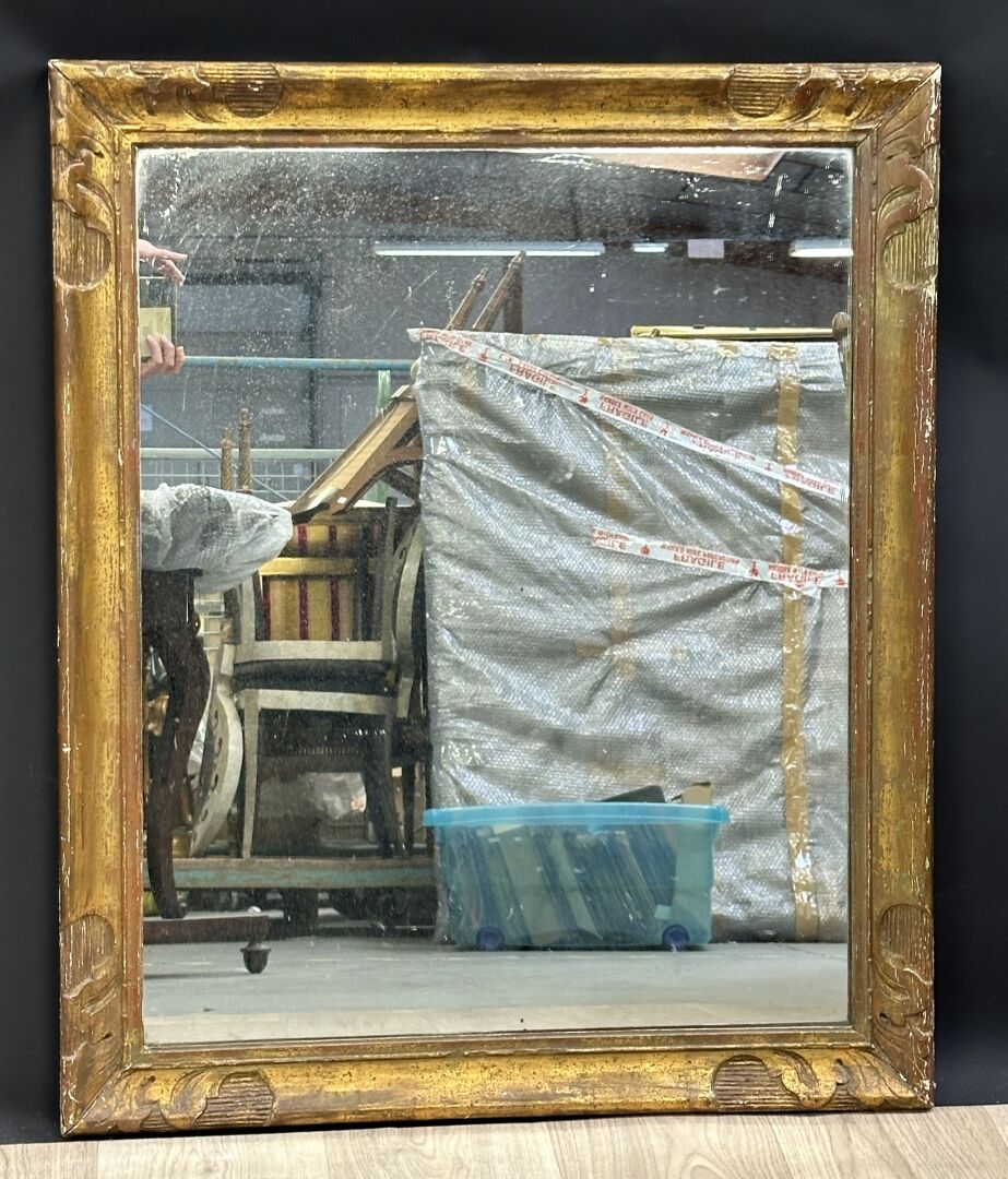 Miroir en bois stuqué doré à décor de feuilles d’acanthe dans les angles (manques). Estimation : 30 - 50 €