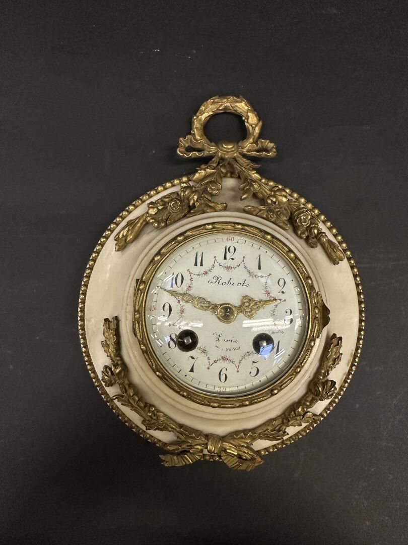 Pendule d’applique en marbre et bronze doré à décor de guirlandes de fleurs et...