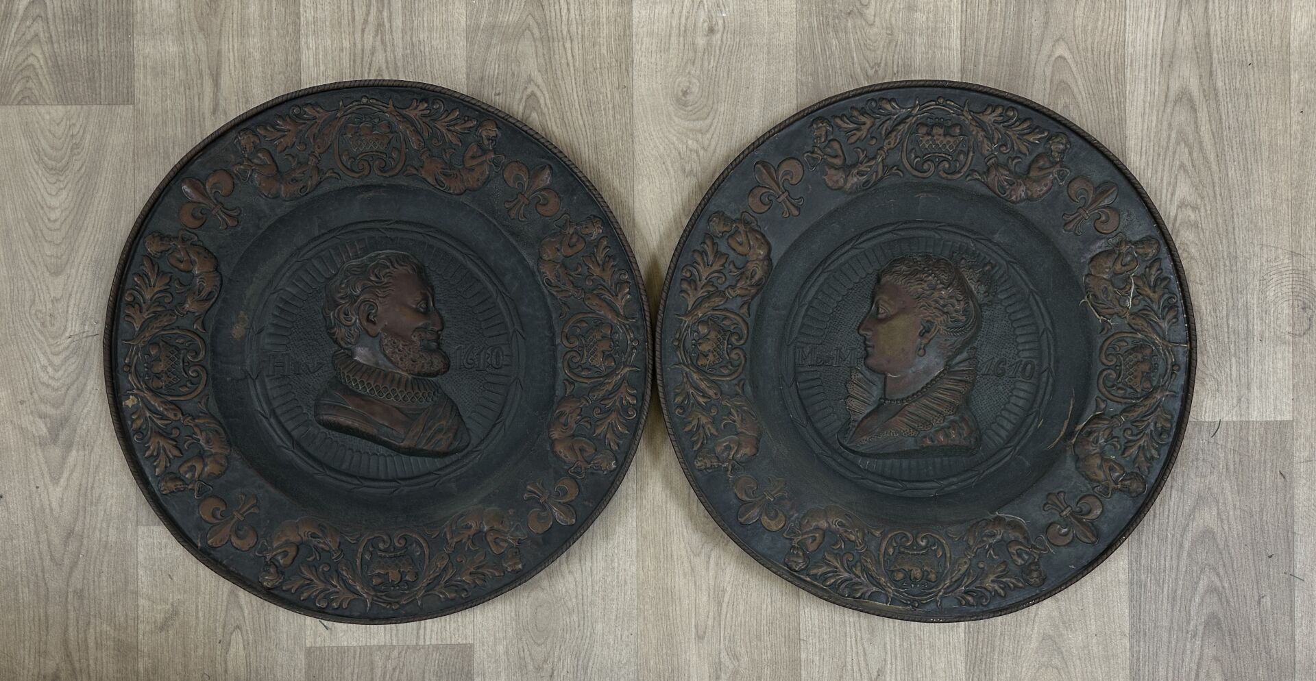 Deux grands plats décoratifs en métal repoussé à l’effigie d’Henri IV et de Marie...
