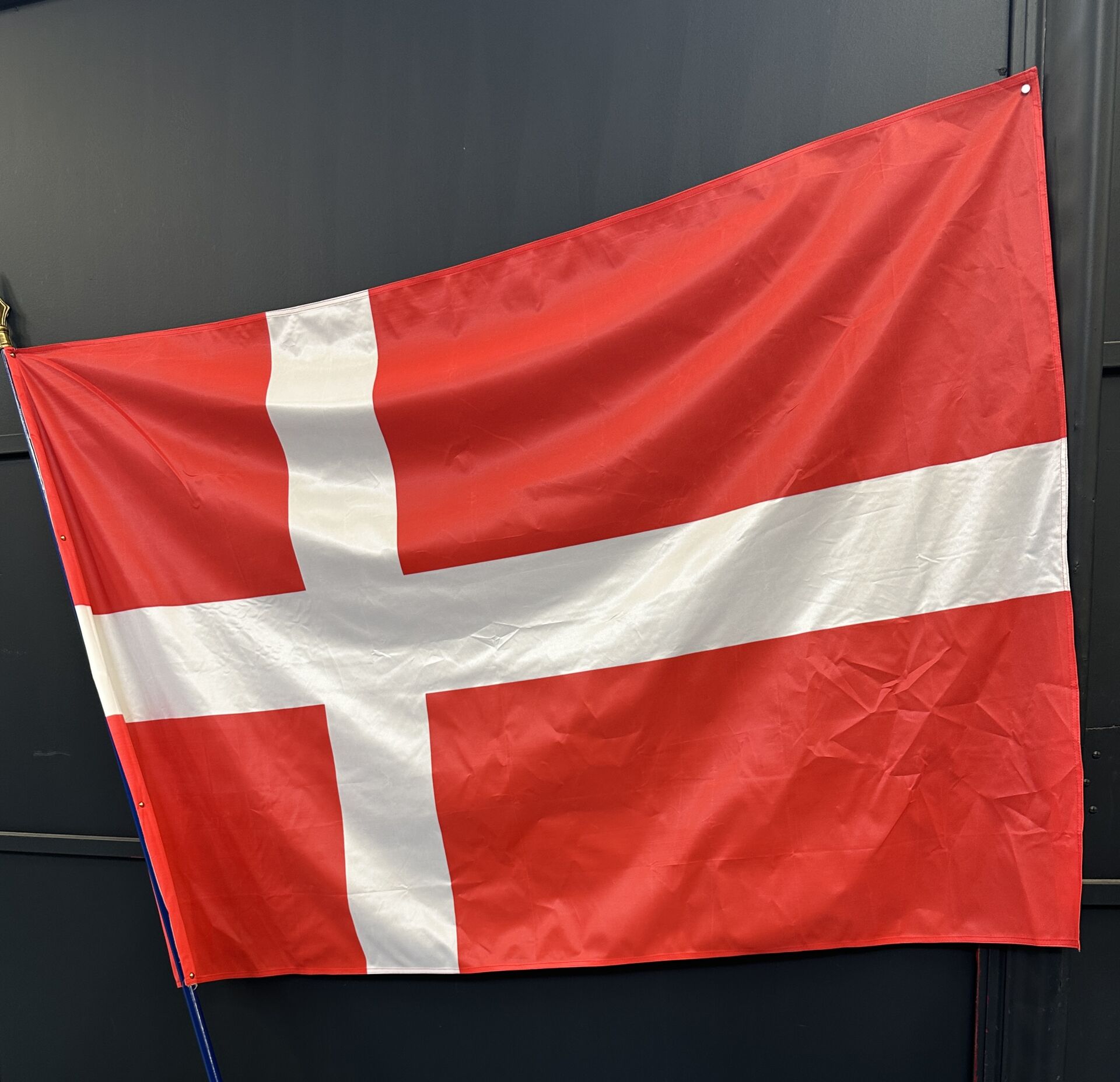 Trois drapeaux sur mât en synthétique et PVC : Europe, France et Danemark.
