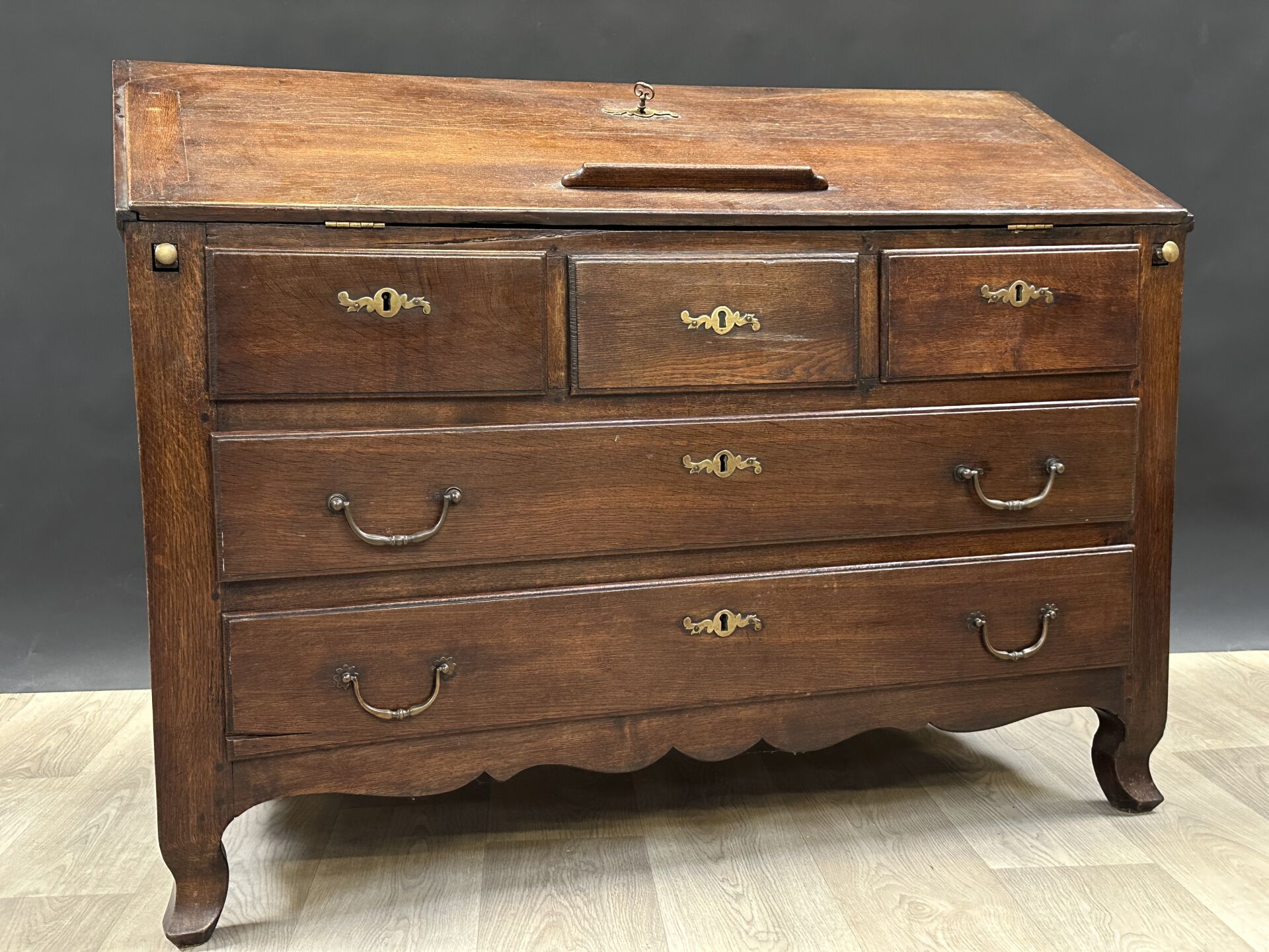Commode scribanne en bois massif ouvrant par quatre tiroirs sur trois rangs et un abattant...