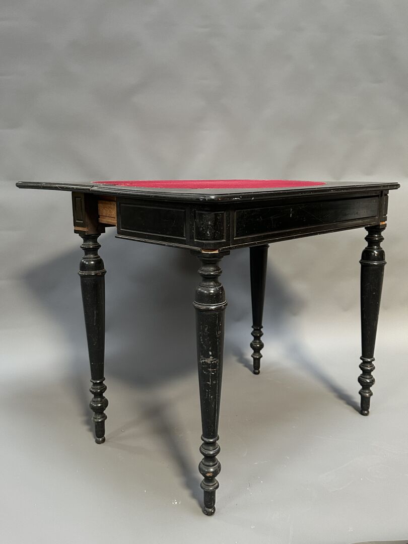 Table à jeux en bois laqué noir, l’abattant carré découvre un feutre rouge. Pieds...