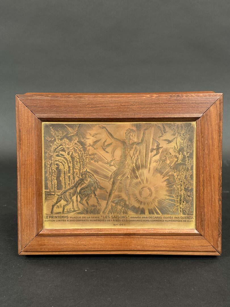 Coffret à cigares en palissandre, le couvercle orné d’une plaque de cuivre à décor...