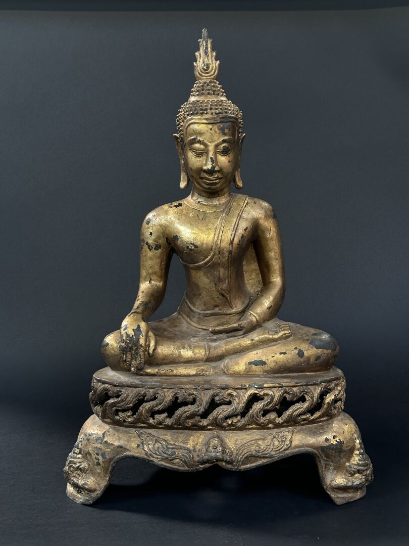 Statue de bouddha en bronze laqué or représenté assis en padmasana sur une base tripode...