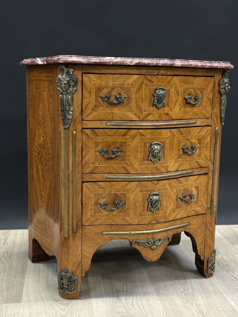 Commode d’entre-deux en bois de placage marqueté ouvrant par trois tiroirs, galbée toutes...