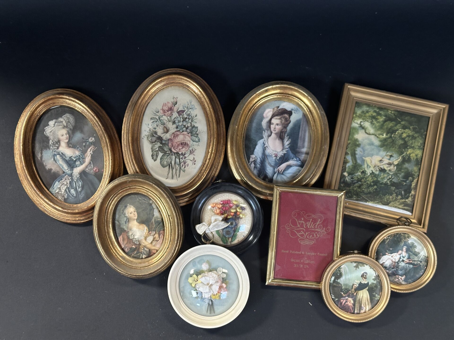 Réunion de neuf petits cadres en bois, métal ou PVC (verres manquant).