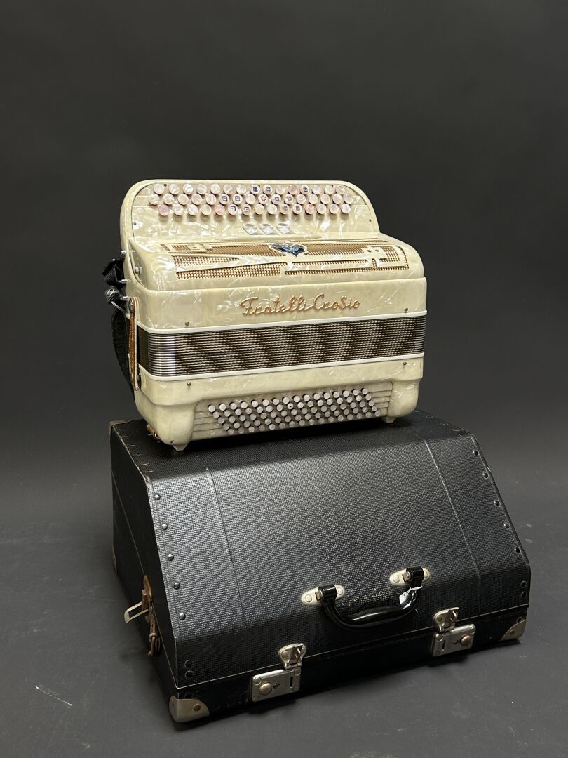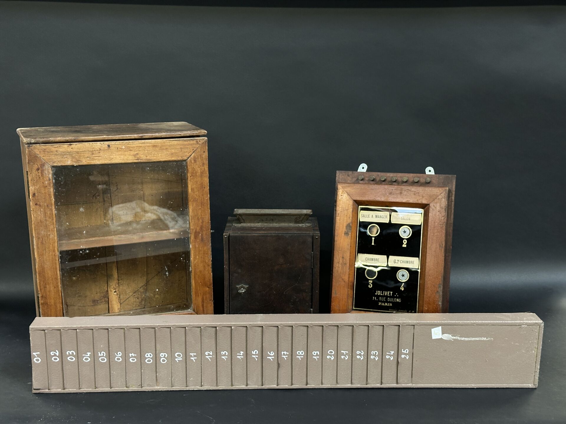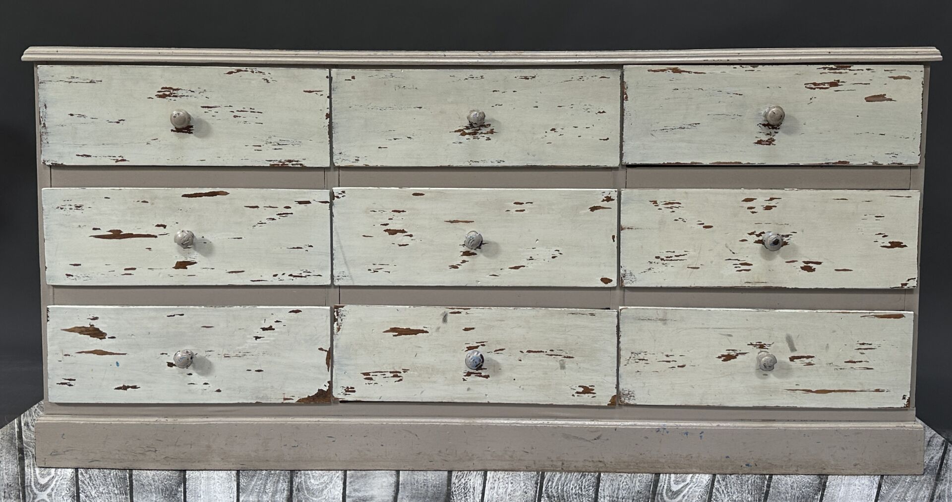 Meuble rangement industriel en métal gris et crème, à trente casiers ouvrant pas abattants...
