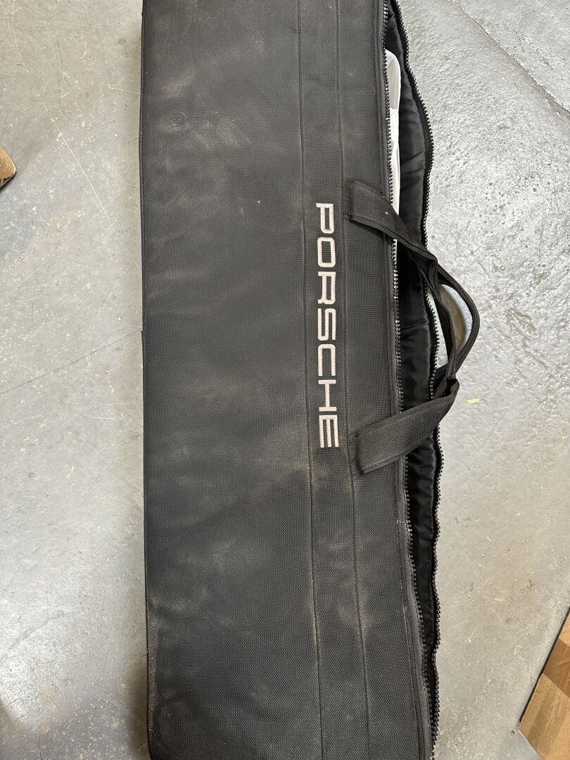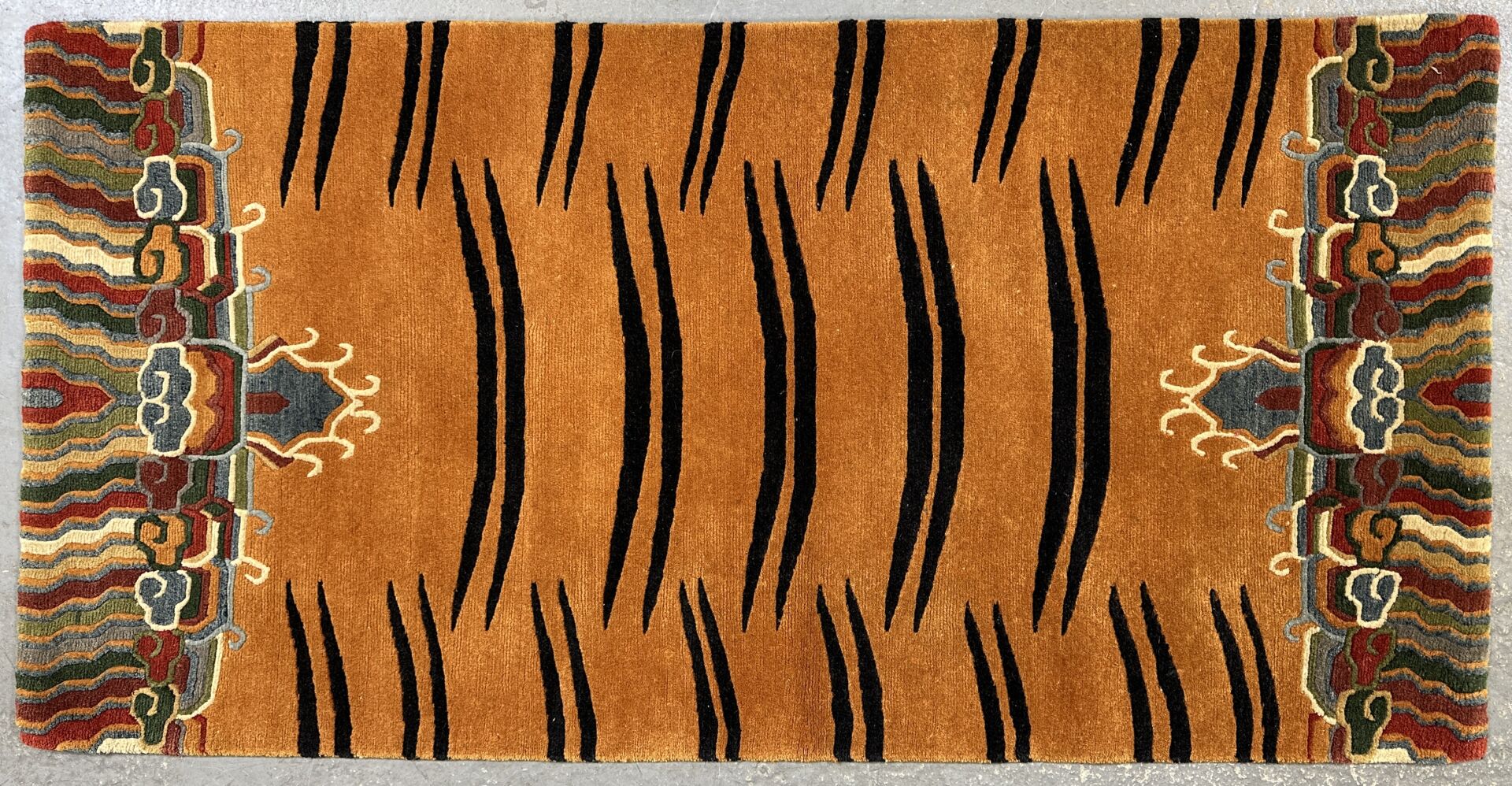 Tapis à motif de rayures de tigre et frise polychrome (bon état).