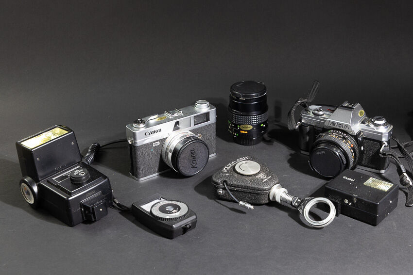 Ensemble de sept appareils photos et un flash dont POLAROID, SUPERFEX.