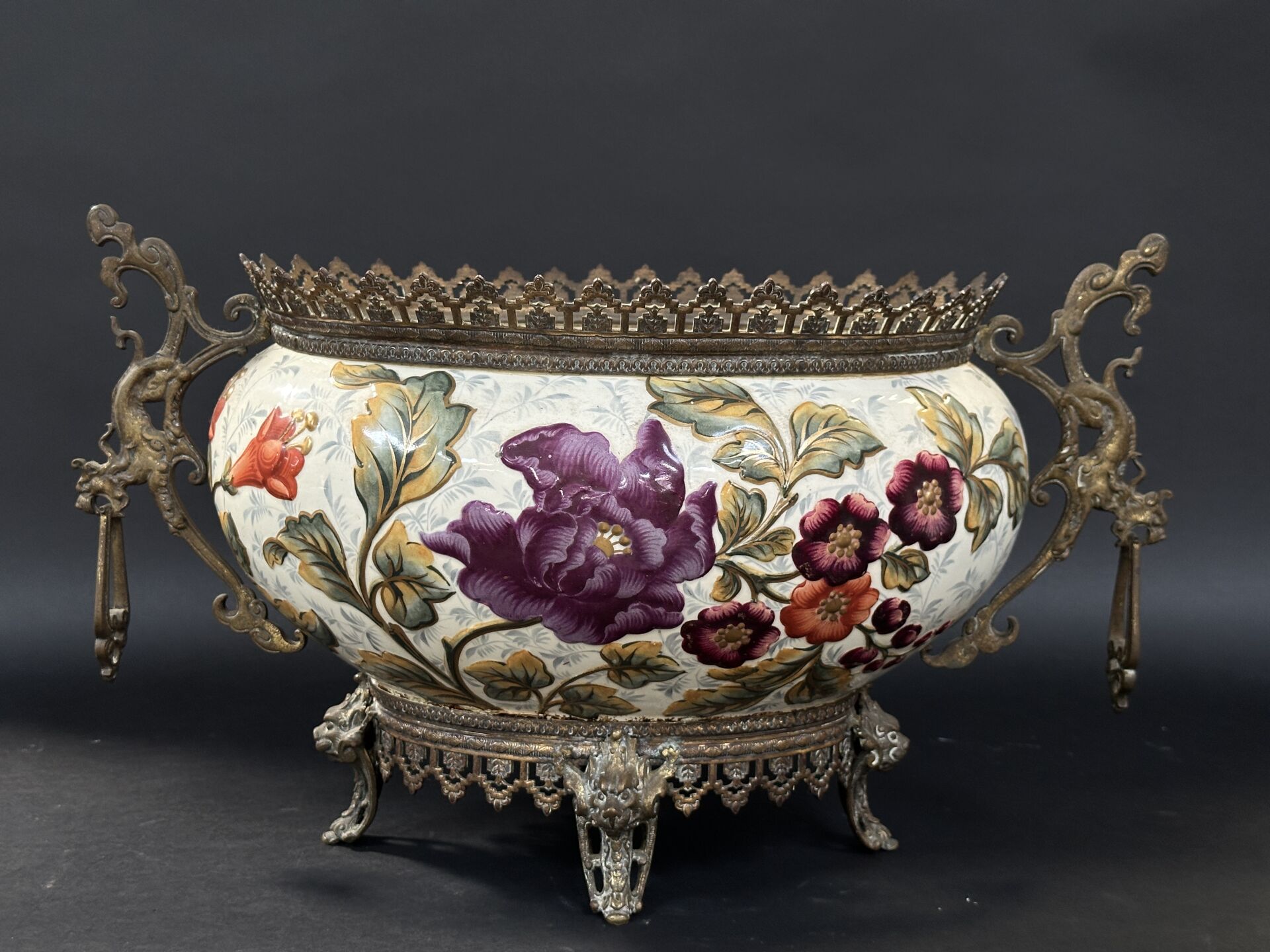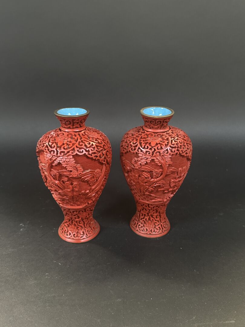 Vase en cuivre et émaux cloisonnés à décor polychrome de phénix et dragons dans des...